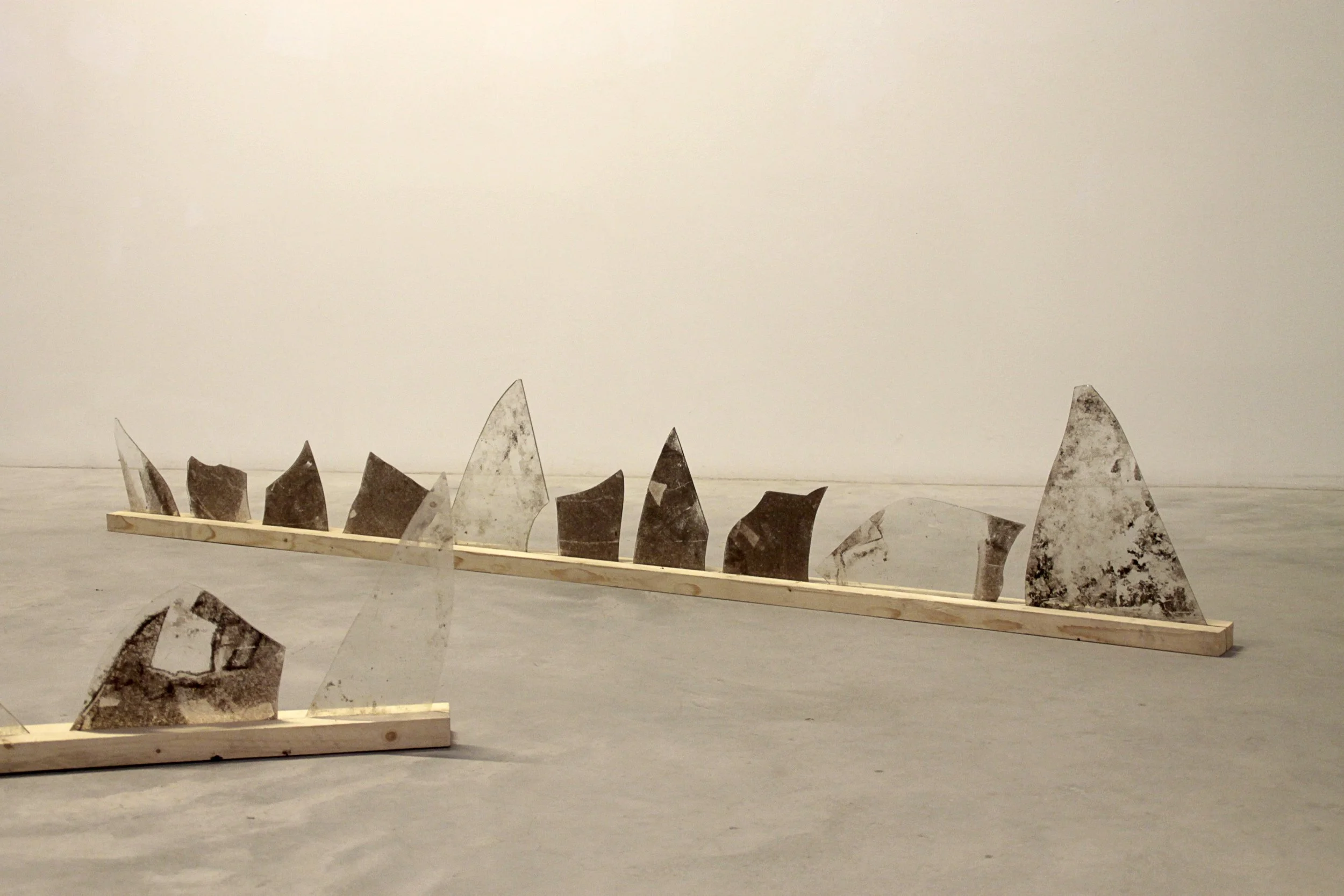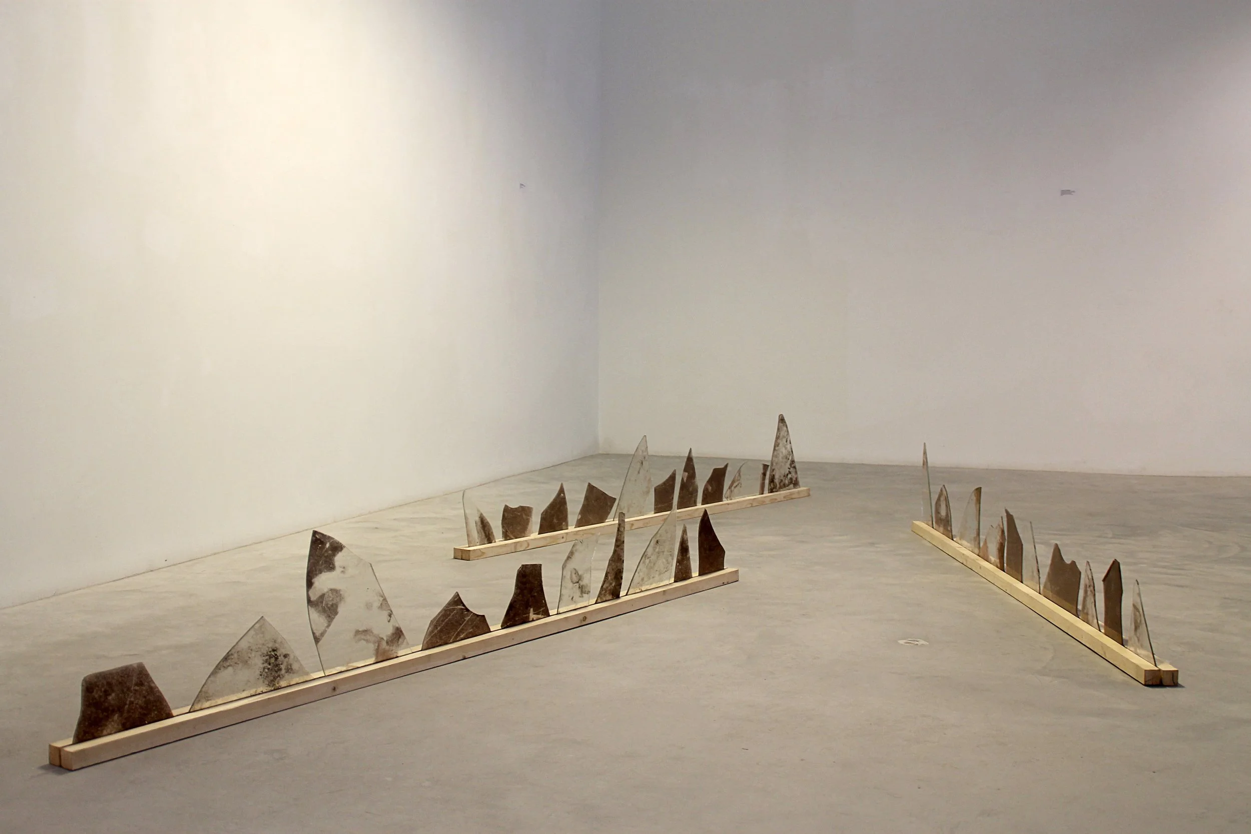 Paisajes del fracaso – madera y vidrio recuperado / 3 uds. de 8 x 200 x 35 cm c/u / conjunto: dimensiones variables / 2016