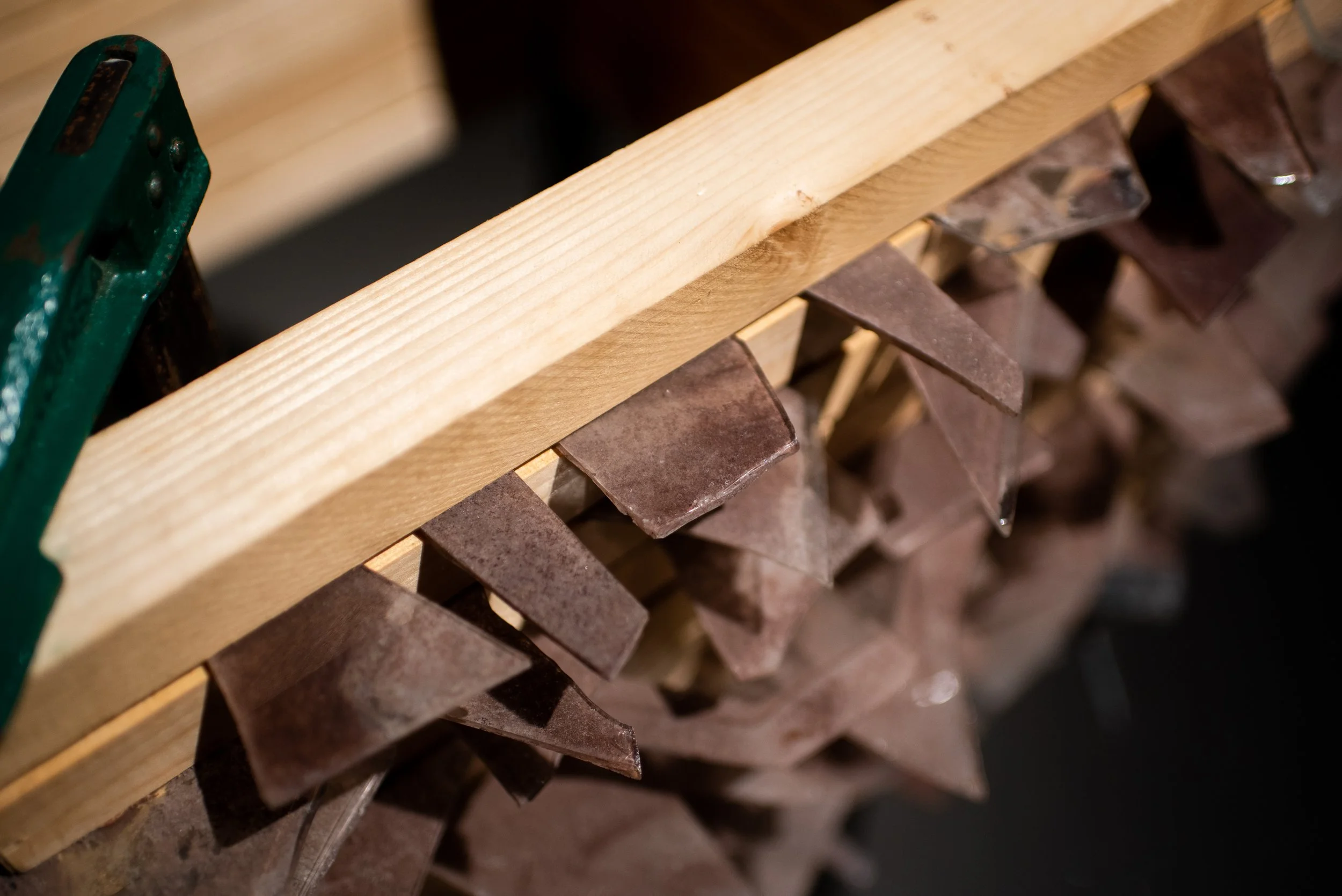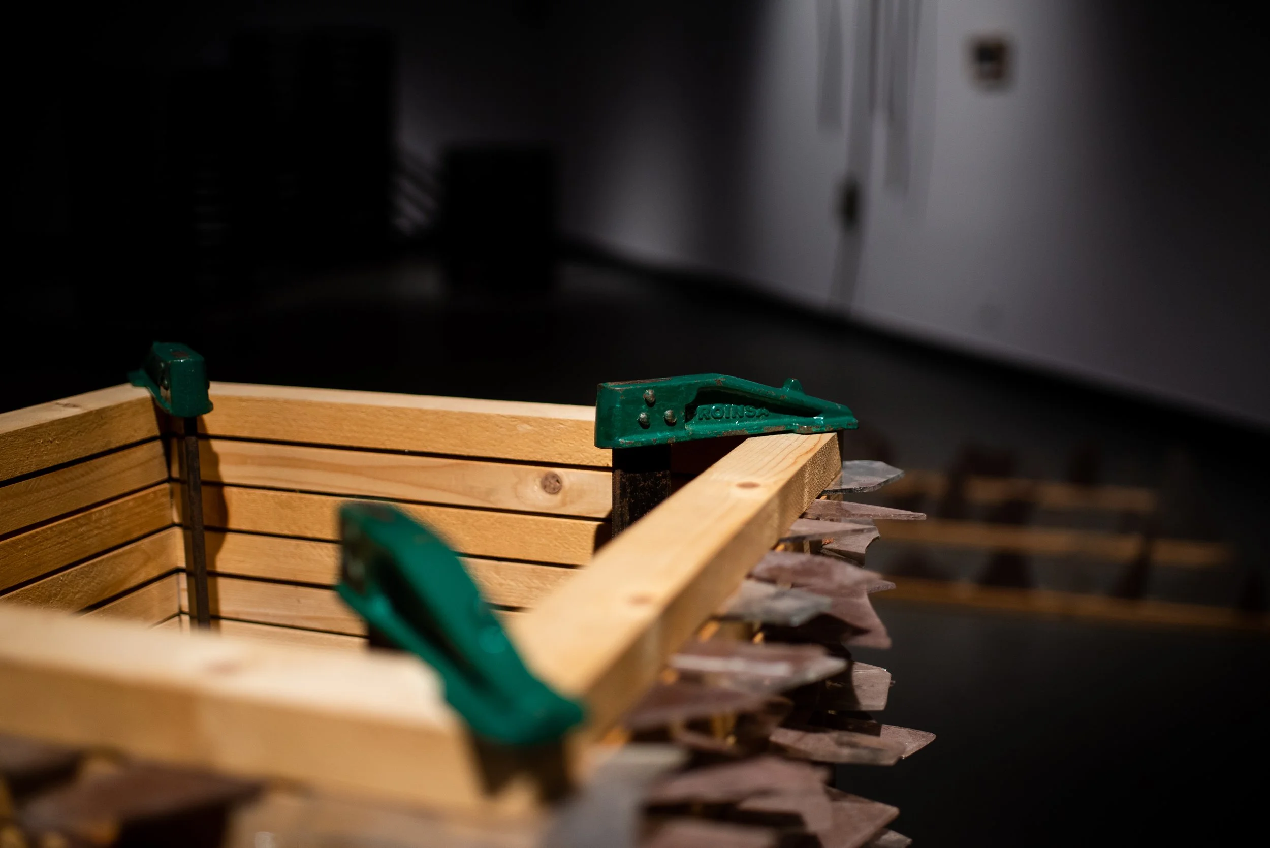 Umbral, vacío, vestigio – madera, vidrio recuperado y sargentos / 68 x 68 x 110 cm / 2019